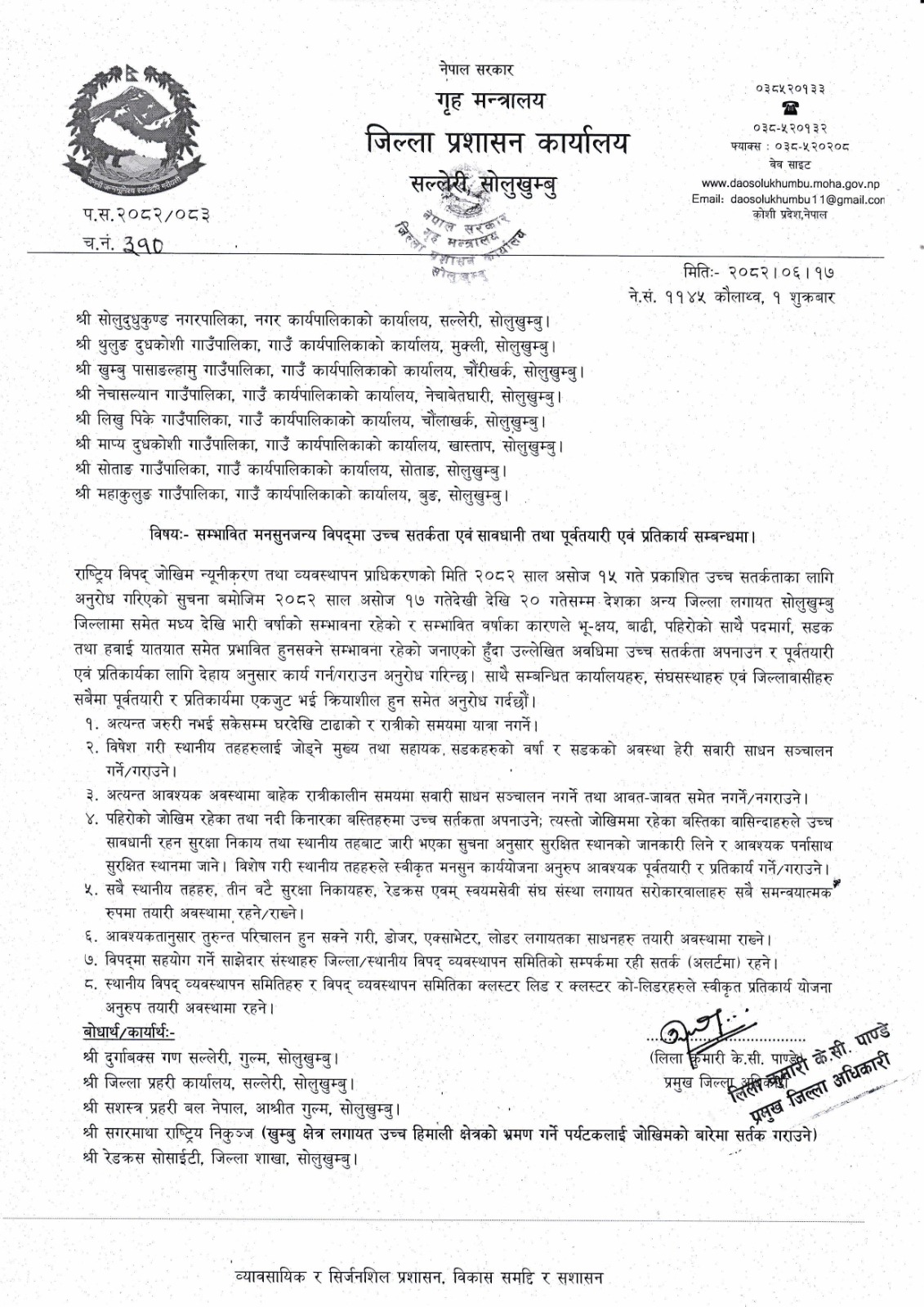 प्रमुख जिल्ला अधिकारी लिला कुमारी केसी पाण्डेले जारी गरेको सूचनामा स्थानीय तहहरुलाइ जोड्ने सडकहरूको अवस्था हेरी बिग्रीएको भए सञ्चालन गर्ने व्यवस्था मिलाउन, बाढी पहिरोको जोखिम रहेका नदी किनारका बस्ती तथा गाउँहरूमा उच्च सतर्कता अपनाउने र जोखिम हेरेर सुरक्षित स्थानमा सार्ने, स्थानीय तहहरु, ३ वटै सुरक्षा निकाय, रेडक्रस लगायतका स्वयंसेवी संस्थाहरूलाई उद्धार तथा राहतमा तम्तयार रहन तथा लिड क्लस्टर र को लिड क्लस्टरहरुले विपद प्रतिकार्यका लागी बनाइएको स्वीकृत योजना अनुरूप तयारी अवस्थामा रहन भनिएको छ । मौसम पूर्वानुमान महाशाखाले असोज १७ देखी २० सम्म सोलुखुम्बु सहित देशका धेरै जिल्लाहरूमा भारी वर्षात सहित बाढी पहिरोको अनुमान गरेपछि अहिले प्रशासन सहितका सम्बद्ध निकायहरूले तदारुकताका साथ विपदको सम्भावित जोखिमलाई हेरेर काम गरिरहेका छन् ।
