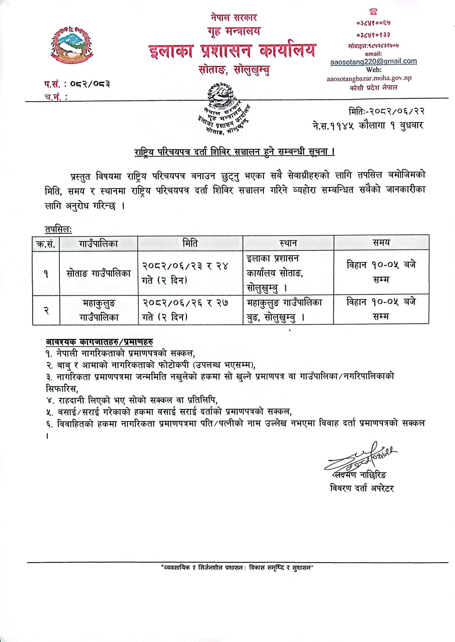 असोज २३, सोलुखुम्बु । सोलुखुम्बुका दुई गाउँपालिकामा राष्ट्रिय परिचयपत्र दर्ता शिविर सञ्चालन गरिने भएको । जिल्लाको सोताङ गाउँपालिका र महाकुलुङ गाउँपालिकामा छुटेका नागरिकलाई लक्षित गरी शिविर सञ्चालन गर्न लागिएको हो ।