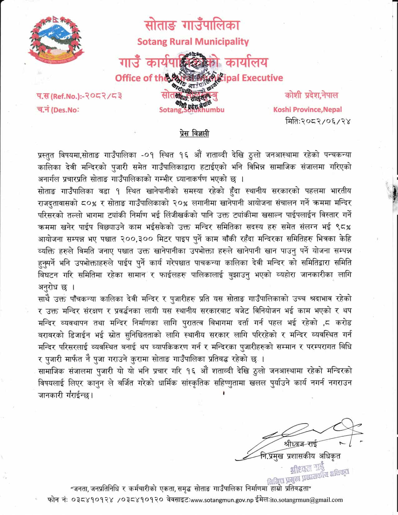 गाउँपालिकाले मन्दिरलाई पुरातत्व विभागमा सूचिकृतकाे पहल गरी ८ करोडको मन्दिर निर्माणका लागी श्रोत सुनिश्चित गरिसकेको भन्दै गाउँपालिकाले मन्दिर प्रति गाउँपालिकाको श्रद्धाभाव रहेको जनाएको छ । गाउँपालिकाले अनर्गल प्रचार गरेर धार्मिक सहिष्णुता र आस्था माथि प्रहार नगर्न पनि अनुरोध गरेको छ । यस्तै उक्त खानेपानी आयोजनाको ९८ प्रतिशत काम सम्पन्न भइसकेको र बाँकी ३ सय मिटर पाइप पुर्ने काम समेत चाँडै सम्पन्न गरेर खानेपानी व्यवस्थापन गरिने गाउँपालिकाले दावि गरेको छ ।