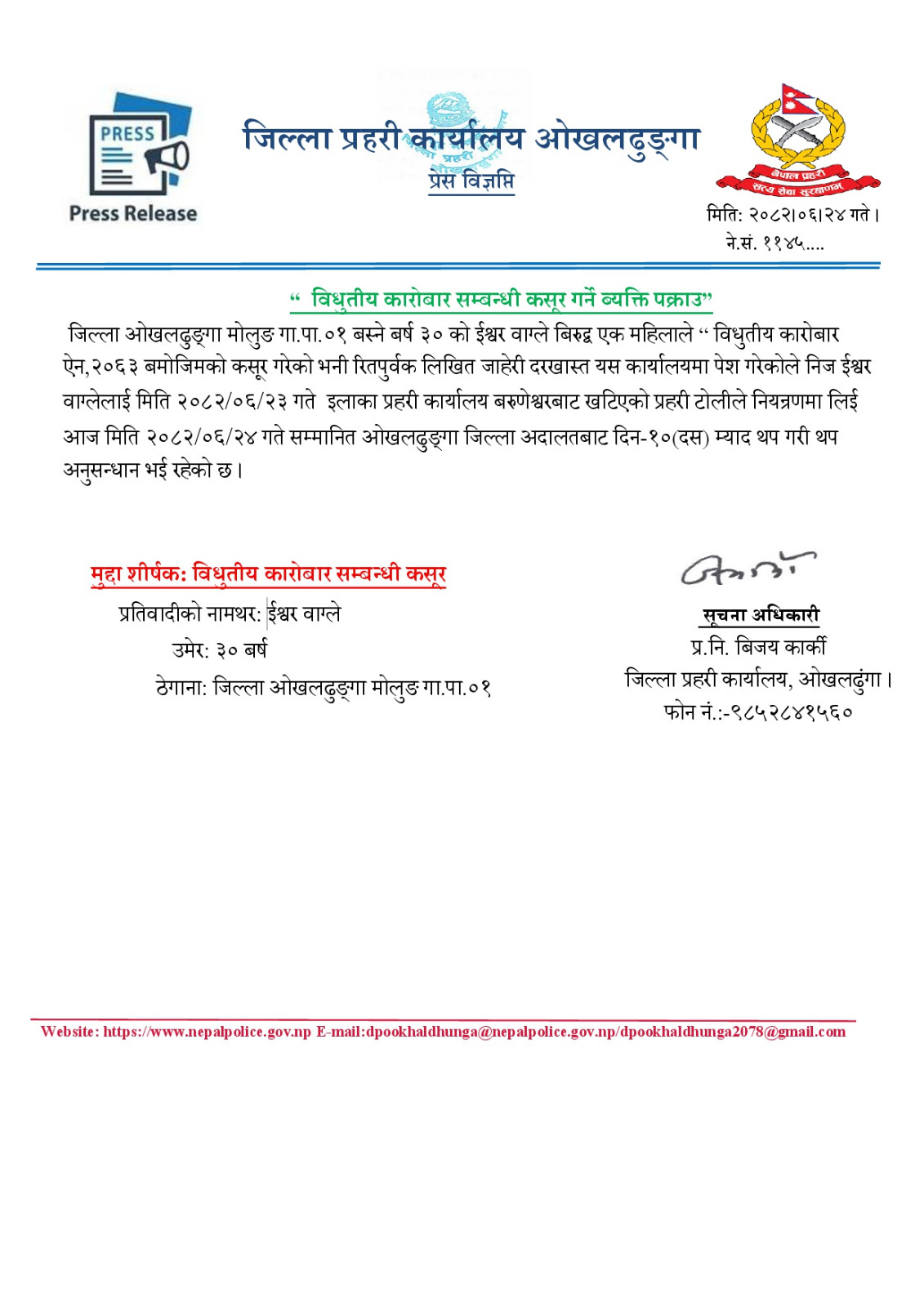 असोज २५, सोलुखुम्बु । विधुतीय कारोबार सम्बन्धी कसूर गरेको आरोपमा ओखलढुंगाका एक युवक पक्राउ परेका छन् । जिल्लाको मोलुङ गाउँपालिका–१ निवासी ३० वर्षीय ईश्वर वाग्लेलाई प्रहरीले नियन्त्रणमा लिएको हो ।