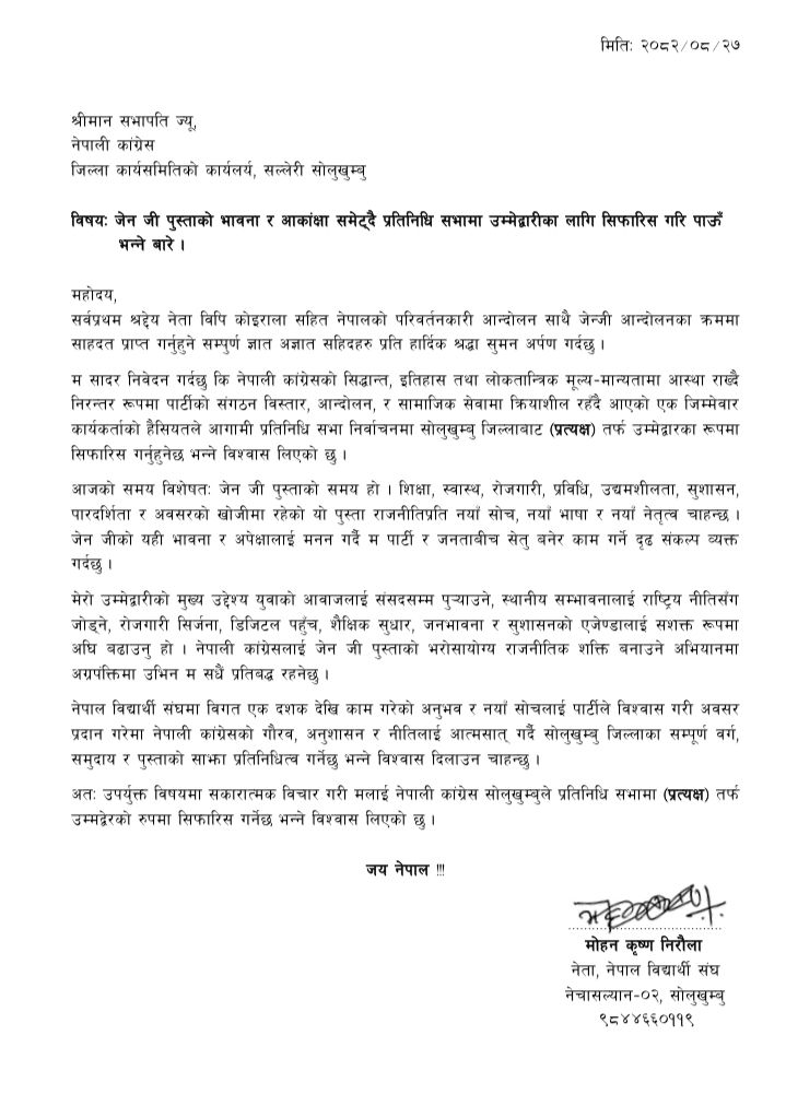 नेपाल विद्यार्थी संघ नेचासल्यान–२ सोलुखुम्बुका नेता निरौलाले नेपाली कांग्रेस जिल्ला कार्यसमिति सोलुखुम्बुलाई सम्बोधन गर्दै बुझाएको सिफारिस पत्रमा, स्व. बीपी कोइरालासहित कांग्रेसले नेतृत्व गरेको परिवर्तनकारी आन्दोलन र त्यसमा Gen-Z पुस्ताको सक्रिय सहभागिताको स्मरण गरिएको छ।