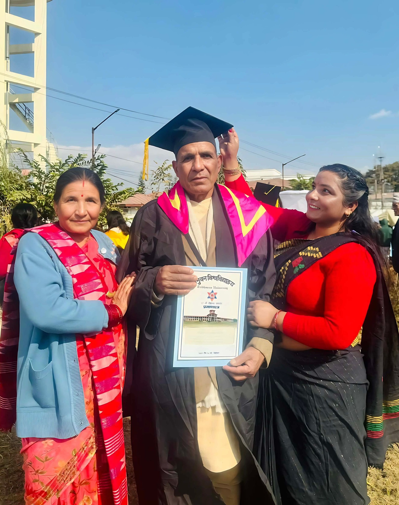 पौष ११, सोलुखुम्बु । त्रिभुवन विश्वविद्यालयको ५१औँ दीक्षान्त समारोहमा खोटाङका इन्द्रबहादुर थापा सर्वाधिक चर्चामा रहनुभएको छ । ६८ वर्षको उमेरमा समाजशास्त्र (सोसोलोजी) विषयमा स्नातकोत्तर उपाधि हासिल गर्दै उहाँले जीवनभरको सिकाइको प्रेरणादायी उदाहरण प्रस्तुत गर्नुभएको हो । ३० वर्षसम्म सरकारी सेवामा कार्यरत रहनुभएका थापाले आफ्ना ६ जना छोराछोरीलाई अध्ययन गराइसकेपछि आफूले अधूरो रहेको उच्च शिक्षा पूरा गर्ने चाहना पूरा गर्नुभएको बताउनुभयो ।