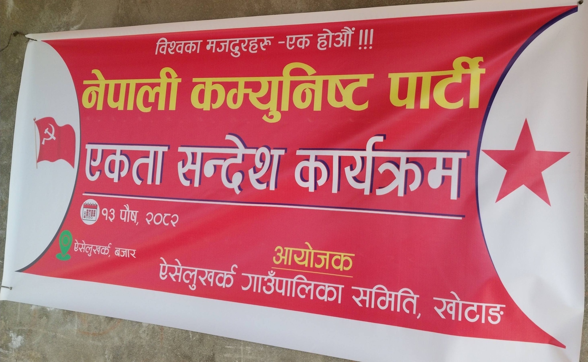 पौष १४, सोलुखुम्बु । नेपाली कम्युनिष्ट पार्टीको एकता कार्यक्रम ऐसेलुखर्कमा आइतबार भव्य रूपमा सम्पन्न भएको छ । कार्यक्रम नेपाली कम्युनिष्ट पार्टी प्रदेश समिति सदस्य प्रशुराम राईको अध्यक्षतामा तथा पार्टी केन्द्रीय सदस्य रामकुमार राई (पासाङ) को प्रमुख आतिथ्यतामा सम्पन्न भएको हो ।