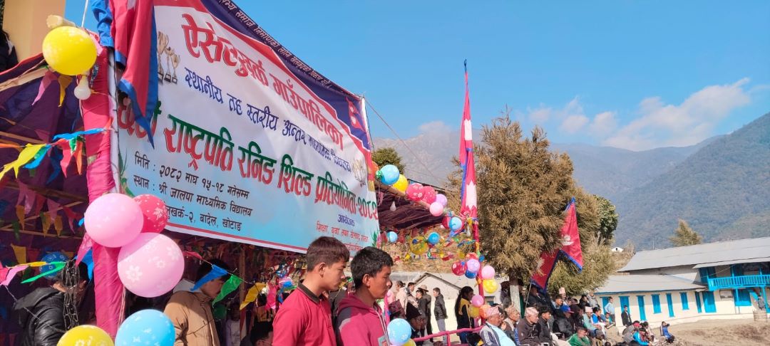 माघ १६, सोलुखुम्बु । खोटाङको ऐसेलुखर्क गाउँपालिकामा स्थानीय तह स्तरीय छैटौं राष्ट्रपति रनिङ शिल्ड प्रतियोगिता जारी रहेको छ । “स्वास्थ्यका लागि खेलकुद, राष्ट्रका लागि खेलकुद” भन्ने मूल नाराका साथ बिहीबारदेखि प्रतियोगिता सुरु भएको हो । गाउँपालिकाका अनुसार प्रतियोगिता वडा नम्बर २ स्थित जालपा माध्यमिक विद्यालय, बादेलमा सञ्चालन भइरहेको छ ।