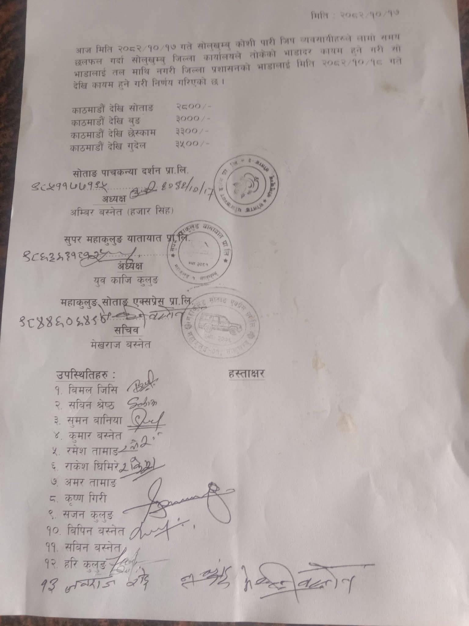सुपर महाकुलुङ यातायात प्रा.लि.का अध्यक्ष युवकाजी कुलुङका अनुसार, नयाँ भाडादरअनुसार काठमाडौँदेखि सोताङका लागि २८ सय रुपैयाँ, काठमाडौँदेखि बुङका लागि ३ हजार रुपैयाँ, काठमाडौँदेखि छेस्का ३ हजार ३ सय रुपैयाँ र काठमाडौँदेखि गुदेलसम्म ३ हजार ५ सय रुपैयाँ तोकिएको छ । यातायात व्यवसायीहरूले यात्रु सुविधा सुनिश्चित गर्दै भाडादरलाई नियमित गर्ने र अनावश्यक विवादबाट बच्ने उद्देश्यका साथ यो निर्णय गरिएको बताउनुभयो ।